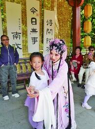 在浙江温州市鹿城区松台山脚下,戏曲演员与小游客互动。新华社发