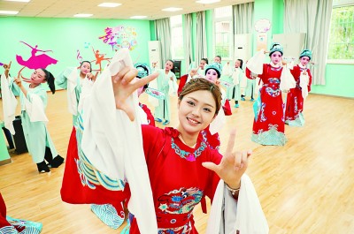 安徽肥西,老师带领小朋友一起学唱黄梅戏。新华社发
