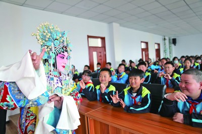 河北承德市戏剧协会的演员在为小学生进行传统戏曲表演。刘环宇摄/光明图片