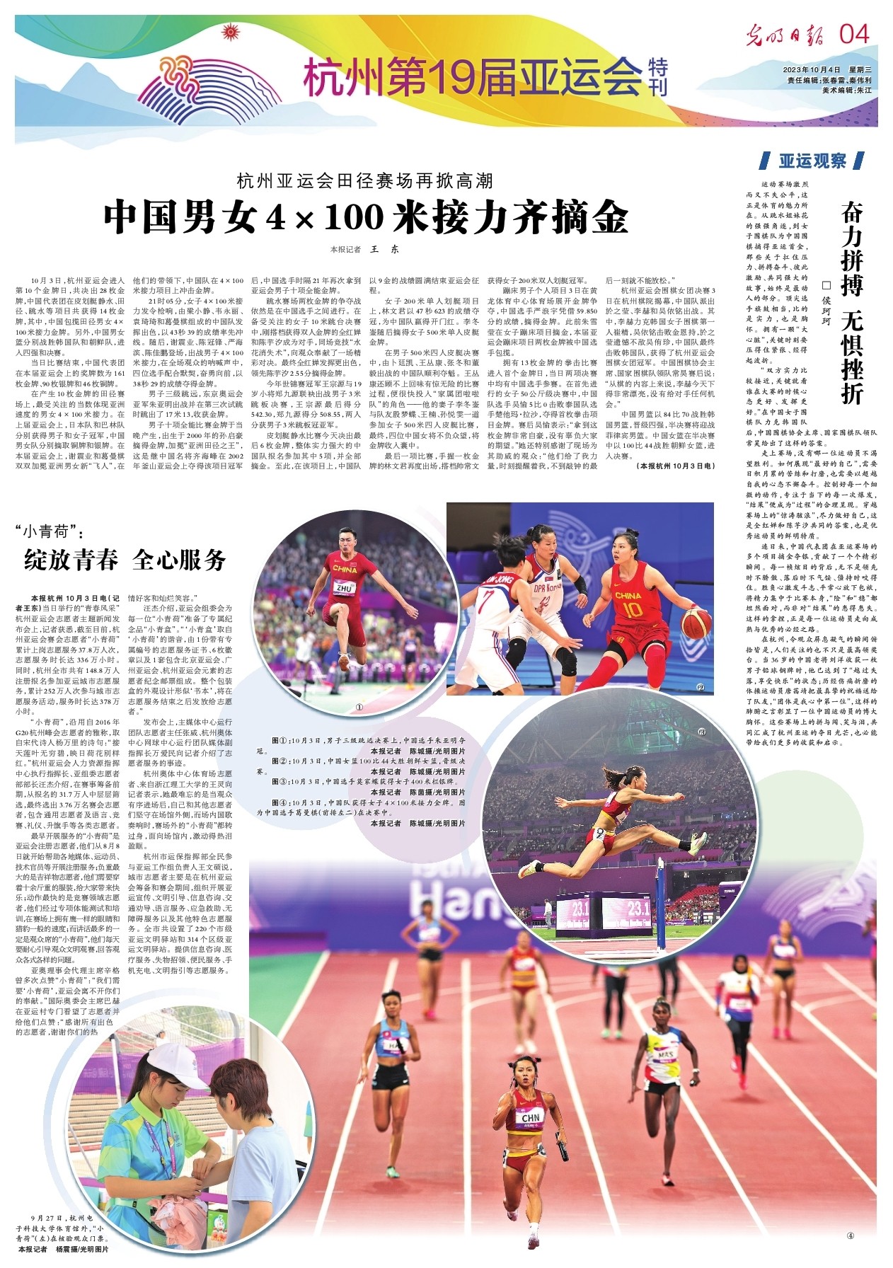 10月3日,杭州亚运会进入第10个金牌日,共决出28枚金牌,中国代表团在皮划艇静水、田径、跳水等项目共获得14枚金牌,其中,中国包揽田径男女4×100米接力金牌。另外,中国男女篮分别战胜韩国队和朝鲜队,进入四强和决赛。