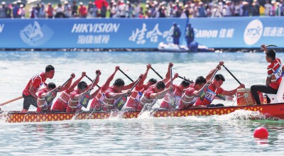10月4日,龙舟项目男子组12人龙舟200米直道竞速赛中,中国队获得冠军。图为中国选手在比赛中。 新华社发