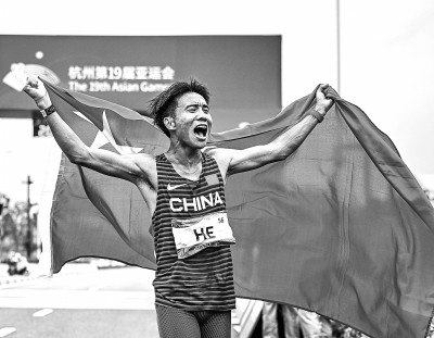 10月5日,男子马拉松决赛中,中国选手何杰夺得冠军。图为何杰在赛后庆祝。新华社发