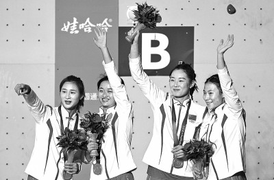 10月4日,攀岩项目女子团体速度接力决赛中,中国队夺冠。图为选手汪生艳、张少琴、牛笛、邓丽娟(从左至右)在颁奖仪式上。 新华社发