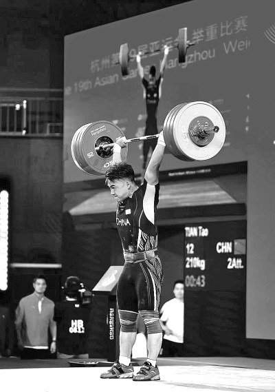10月5日,中国选手田涛夺得举重男子96公斤级比赛金牌。本报记者 杨震摄/光明图片