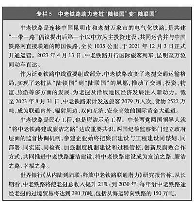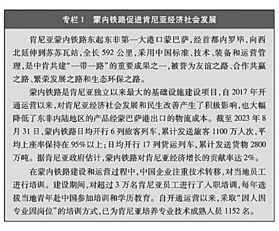 经济走廊和国际通道建设卓有成效。共建国家共同推进国际骨干通道建设,打造连接亚洲各次区域以及亚欧非之间的基础设施网络。中巴经济走廊方向,重点项目稳步推进,白沙瓦-卡拉奇高速公路(苏库尔至木尔坦段)、喀喇昆仑公路二期(赫韦利扬-塔科特段)、拉合尔轨道交通橙线项目竣工通车,萨希瓦尔、卡西姆港、塔尔、胡布等电站保持安全稳定运营,默拉直流输电项目投入商业运营,卡洛特水电站并网发电,拉沙卡伊特别经济区进入全面建设阶段。新亚欧大陆桥经济走廊方向,匈塞铁路塞尔维亚贝尔格莱德-诺维萨德段于2022年3月开通运营,匈牙利布达佩斯-克莱比奥段启动轨道铺设工作;克罗地亚佩列沙茨跨海大桥迎来通车一周年;双西公路全线贯通;黑山南北高速公路顺利建成并投入运营。中国-中南半岛经济走廊方向,中老铁路全线建成通车且运营成效良好,黄金运输通道作用日益彰显;作为中印尼共建“一带一路”的旗舰项目,时速350公里的雅万高铁开通运行;中泰铁路一期(曼谷-呵叻)签署线上工程合同,土建工程已开工11个标段(其中1个标段已完工)。中蒙俄经济走廊方向,中俄黑河公路桥、同江铁路桥通车运营,中俄东线天然气管道正式通气,中蒙俄中线铁路升级改造和发展可行性研究正式启动。中国-中亚-西亚经济走廊方向,中吉乌公路运输线路实现常态化运行,中国-中亚天然气管道运行稳定,哈萨克斯坦北哈州粮油专线与中欧班列并网运行。孟中印缅经济走廊方向,中缅原油和天然气管道建成投产,中缅铁路木姐-曼德勒铁路完成可行性研究,曼德勒-皎漂铁路启动可行性研究,中孟友谊大桥、多哈扎里至科克斯巴扎尔铁路等项目建设取得积极进展。在非洲,蒙内铁路、亚吉铁路等先后通车运营,成为拉动东非乃至整个非洲国家纵深发展的重要通道。