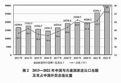 贸易投资规模稳步扩大。2013-2022年,中国与共建国家进出口总额累计19.1万亿美元,年均增长6.4%;与共建国家双向投资累计超过3800亿美元,其中中国对外直接投资超过2400亿美元;中国在共建国家承包工程新签合同额、完成营业额累计分别达到2万亿美元、1.3万亿美元。2022年,中国与共建国家进出口总额近2.9万亿美元,占同期中国外贸总值的45.4%,较2013年提高了6.2个百分点;中国民营企业对共建国家进出口总额超过1.5万亿美元,占同期中国与共建国家进出口总额的53.7%。