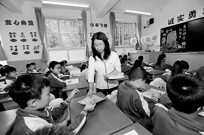 8月26日,甘肃省平凉市中小学开学,一名老师正在给学生分发教材。吴希会摄/光明图片