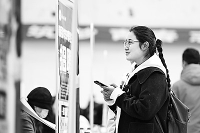 青海民族大学2024届毕业生冬季大型校园招聘会上,一名学生在查看企业招聘需求。新华社发