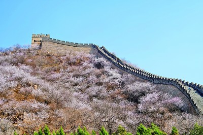 4月5日,北京水关长城内外山花烂漫,雄伟的长城与花海相互映衬,景色优美,吸引游人前来踏青赏景。本报记者 郭俊锋摄/光明图片