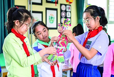 近年来,内蒙古自治区呼和浩特市玉泉区小召小学开设以“影韵动校园 非遗润心田”为主题的皮影社团,通过制作皮影、表演皮影戏,鉴赏皮影艺术等形式,让孩子们领悟传统文化的内涵。图为4月22日,学生们在制作皮影戏表演道具。丁根厚摄/光明图片