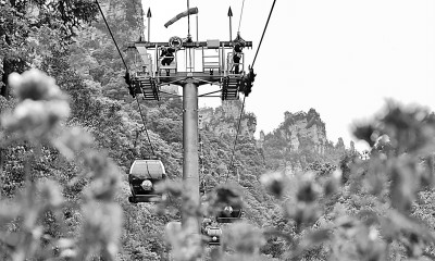 “五一”国际劳动节,各行各业的劳动者坚守岗位,在一线忙碌。图为5月1日,在湖南张家界国家森林公园天子山,索道工作人员在支架上巡检设备。新华社发