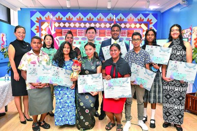 “汉语桥”中文比赛近日分别在德国、斐济、老挝等国举行。图为6月8日,在斐济首都苏瓦,“汉语桥”世界中学生中文比赛斐济赛区参赛选手和嘉宾合影。新华社发
