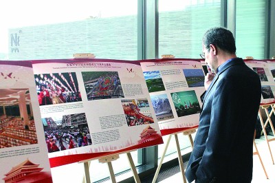 9月30日,中国驻挪威使馆在挪威国家博物馆举行国庆招待会。图为现场来宾驻足观看“庆祝中华人民共和国成立75周年”主题展览。本报驻赫尔辛基记者 邓宇飞摄/光明图片