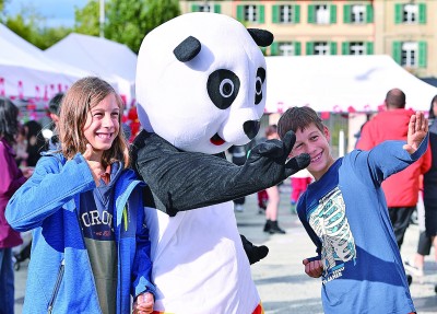 9月27日,在瑞士伯尔尼“遇见中国:庆祝中华人民共和国成立75周年”文化节上,孩子们与扮成大熊猫的工作人员合影。新华社发