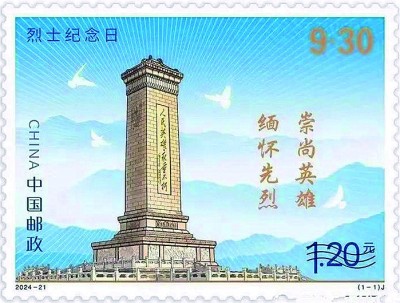 今年9月30日是中国第11个烈士纪念日,中国邮政发行《烈士纪念日》(图①)纪念邮票一套1枚,邮票以蓝天下的人民英雄纪念碑为主体,衬以群山,几只白鸽在四周飞翔,邮票右侧的“崇尚英雄 缅怀先烈”表现烈士纪念日的主题,上方书写“烈士纪念日”与“9·30”。