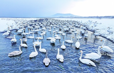 11月27日,在山东省荣成天鹅湖国家级自然保护区一处水域,成群的大天鹅在雪中漫步、游弋、觅食,与雪景相映成趣。李信君摄/光明图片