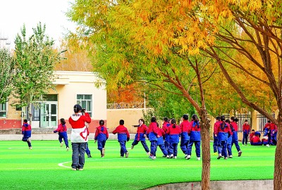 这是克州首所由西部计划志愿者包校支教的试点学校。校园里,一株株馒头柳傲然挺立,枝条伸向天空,金灿灿的树叶落了一地。随着清脆的下课铃声响起,学生们飞奔向操场和球场。