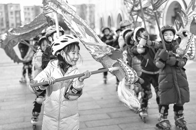元旦将至,各地组织丰富多彩的活动,喜迎新年。图为12月26日,在山东省荣成市实验小学校园内,孩子们在练习轮滑舞龙,为迎新年文艺会演做准备。李信君摄 光明图片