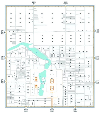 若此说不误,大都北城可按安贞门街和健德门街分为两排各三区,每区各三坊。