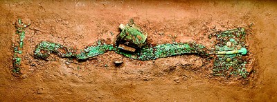 华夏民族很早就将蛇作为图腾之一。建立了夏王朝的大禹,传说其母名为“修己”,“己”与“巳”相通,而“巳”字的写法又是从蛇形演化而来,所以“修己”的字面意思便是“修长的蛇”。一般认为,她便是来自以蛇为图腾的部落。其子之名“禹”字的写法其实也与蛇形有关。而大禹的儿子夏后启,在《山海经》中亦被记载为头饰两条青蛇的形象。上古的神话传说一再显示出蛇在夏文明中的重要地位,这一点也为当今不少考古发现所印证。例如河南偃师二里头遗址出土的绿松石龙形器,其细长而扭曲的造型便应源于蛇的姿态。该器一端较大,左右对称并呈方形布局,好似蛇的头部,而其上两个凸起的圆形装饰,又与蛇眼十分相似。遍布器物全身的绿松石,以小块拼镶而成,一如蛇躯所覆鳞片那般闪亮。夏王朝这种源自蛇的图腾信仰,对于后来逐渐融合而成的龙的形象具有十分重要的影响,而在“龙”字的繁体写法中,依然保留着“巳”字的结构。