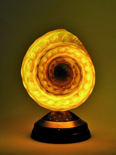 该系列作品的设计灵感来自设计师偶然获得的一只巨大岩螺。在阳光的照射下,岩螺因螺壁厚度的变化呈现出隐隐的通透感。设计师意识到,形态优美、肌理丰富的各类海螺宛如天然灯罩,如果将光源置于螺内,可能会有意想不到的艺术效果。然而,天然海螺往往螺壁厚度不均,透光度参差不齐,因此,灯具制作的第一步便是对其进行细致的打磨。在处理如千手螺、七星螺、红皱岩螺等厚壁海螺时,需要用锉刀将其内壁和外壁上的钙化层轻轻磨掉,在尽可能保留海螺结构肌理的同时,增强其通透感。而对于如东风螺、月光螺、黑线车轮螺等薄壁海螺,则需以细砂纸轻磨,使其内壁平整、厚度均匀,保证良好的透光度。