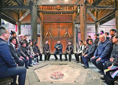 3月17日至18日,中共中央总书记、国家主席、中央军委主席习近平在贵州考察。这是17日下午,习近平在黔东南州黎平县肇兴侗寨考察时,在信团鼓楼同村干部和村民代表围坐在火塘边,共话乡村全面振兴。新华社记者 谢环驰摄