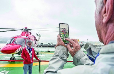 “雪龙2”号上,参观者与直升机合影。新华社发
