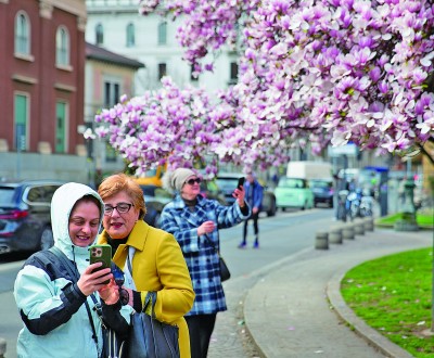 3月18日,人们在米兰的街心公园观赏玉兰花。
