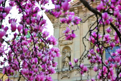 早春时节,意大利米兰街头春花绽放,游人如织。新华社记者 李京摄