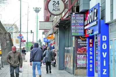 3月19日,受伊斯坦布尔市长被拘留事件影响,土耳其金融市场剧烈波动。伊斯坦布尔证券交易所开盘大幅下跌,一度触发熔断机制,上午10时30分恢复交易后市场仍继续剧烈波动。当天,外汇市场上里拉对美元汇率一度跌至42.42比1,午间回升至39.20比1。里拉对欧元汇率一度突破45比1大关。图为行人经过土耳其安卡拉的一家外币兑换点。新华社发