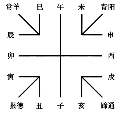 八组“五田文”刻于九宫的空间背景极具意义。人类最早的知识体系是他们对空间和时间有意识地进行的规划,立表测影最先规划的空间图形是二绳,尔后发展出四钩和四维。古人以所立之表为圆心,以一定的长度为半径画圆,在日出和日落时分别记录表影与圆周的交点,以绳连接两点的直线方向就是东西;同时取两点的中点,以绳连接与表的垂直方向就是南北。两条绳子形成的“+”形图像名为“二绳”,其空间概念就是五方。如果配以十二支,指向东西的绳是卯酉绳,也叫卯酉线;指向南北的绳是子午绳,也叫子午线。中国的子午线就是这样测得的。二绳空间并不具有面积的意义,先民从纺织获得灵感,通过无限积绩二绳的做法,使二绳具有了面的意义,这一空间即是五位,也叫日廷。日廷五位的四角必然留有四个矩形缺口,古人称为“四钩”。二绳和五位都属于五方空间,如果古人需要认识比五方更多的方位,那就必须认识东北、西北、东南和西南四个方位,这就是“四维”。将二绳、日廷与四维重叠,便形成中国传统空间的完整图形——九宫,其至少表现了八方和中央九个方位。《淮南子·天文》:“子午、卯酉为二绳,丑寅、辰巳、未申、戌亥为四钩。东北为报德之维也,西南为背阳之维,东南为常羊之维,西北为蹄通之维。”描述的就是这个图形。(图5)