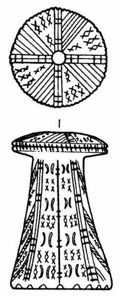 天盖须有天柱支撑,古人对于天柱的认识,同样为以时空认知为核心的中华文明宇宙观的起源提供了佐证,对汉字及华夏文明起源的研究具有重要意义。《天问》:“天极焉加?八柱何当?”天柱不仅设于八方边隈,而且中央天柱还要直居天极之下。其实柳林溪出土的大量陶支座,其形状正作支撑天盖的天柱的模样,甚至有的陶天柱上还刻写着汉字“朱”字(图6)。