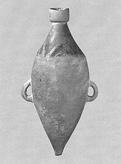 考古资料已将汉字的起源年代上溯到了距今七千年前甚至更早,这打开了中国文字起源研究的新视角。如仰韶时代流行一种被考古学家称为“小口尖底瓶”的陶酒器(图8),甲骨文“酉”字即是这种器物的象形,而以“酉”为原型所创造的文字还有很多,如“酒”“奠”“尊”等,这种器物于商人是无缘得见的,也不太可能了解其礼制意义,进而据其为原型创造文字。今天我们将汉字的起源年代追溯到七千年前,那么,小口尖底瓶流行的时代就成了汉字创造的中间过程,矛盾也就可迎刃而解。