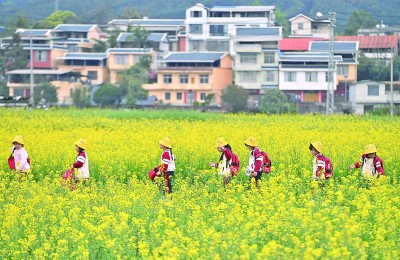 春暖花开,神州各地春意融融。人们来到户外踏青赏花,乐享春光。图为3月21日,在广西柳州市融水苗族自治县融水镇新国村,小朋友在老师的带领下到油菜花地踏青游玩。新华社记者 黄孝邦摄