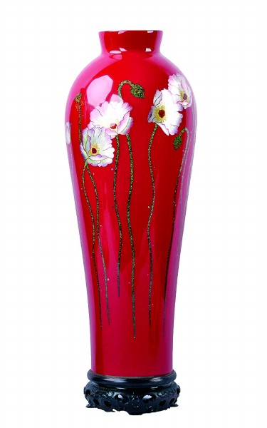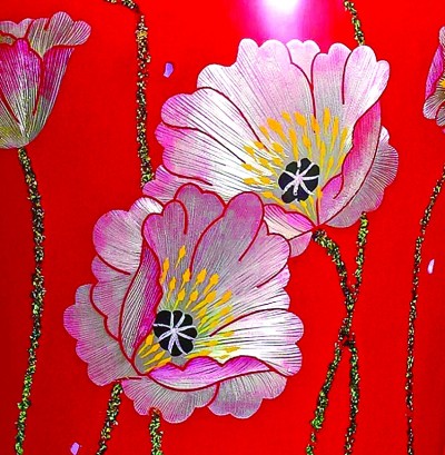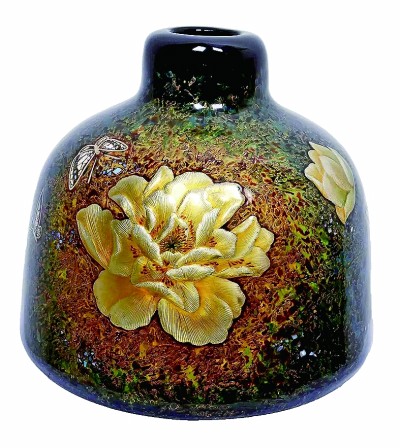相较于金银平脱,雕银丝光在技艺传承的基础上,更多地融入了当代漆艺技法与审美意趣。现代漆器作品通过戗镂技术,在银箔表面雕刻出极为精细的图案纹样,使金属材质的光泽更加立体,在与漆面含蓄光泽的对比下更显作品的艺术层次感,表现出现代漆艺对传统工艺的突破与升华。“春暖花开”脱胎花器结合彰髹、堆漆与雕银丝光、蛋壳镶嵌等多重工艺,曾荣获“第十七届中国工艺美术大师作品暨手工艺术精品博览会”中国工艺美术精品奖金奖。借助变涂工艺渲染的烂漫春花,与利用蛋壳镶嵌工艺刻画的蝴蝶完美呼应,创作者在金属片上完成花瓣纹路的雕刻后再进行晕彩,带给观者强烈的视觉冲击力。“雕银丝光凤戏牡丹圆盘”则以木胎为基底,结合大漆、银、螺钿、锡片等材质制成,凤凰牡丹元素极具写实性,象征着富贵吉祥、和谐幸福,银丝与漆面齐平,纹理清晰可见。此外,由国家级非遗代表性项目成都漆艺代表性传承人、中国工艺美术大师尹利萍创作的“雕银丝光晕彩虞美人花瓶”(图①)等作品同样极具特色。该花瓶以传统实木车镟为胎器,线条流畅,瓶身的植物装饰采用雕银丝光、镶嵌、晕彩等技艺,兼具写实的精细与写意的洒脱,灵动秀丽,高雅生动。“羌风漆艺罐”“馨香漆艺花罐”(图⑤)等造型别致,精雕细琢,器物底色与金属、大漆的碰撞尽显质朴生动。