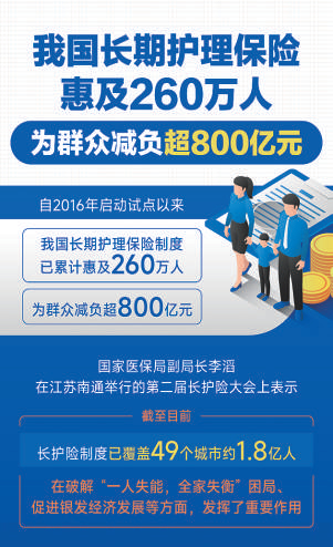 从世界范围的社会保险“大家庭”来看,与养老和医疗保险等其他各项社会保险相比,长期护理保险是一个“新成员”,其历史只有几十年的时间,且目前全球建立独立长期护理保险的国家只有六个,可借鉴的经验和做法较少。2016年,我国在15个城市和两个重点联系省份进行长期护理保险制度试点,2020年第二批14个城市进入试点范围,并对参保对象和保障范围、资金筹集、待遇支付、基金管理、服务管理和经办管理等进一步规范。现在已有49个试点城市长期护理需求得到了有效保障。截至2024年底,长期护理保险参保人数超过1.8亿人,累计享受待遇人数超过260万人,基金支出累计超过800亿元,年人均减负约1.4万元。经过九年探索,我国长期护理保险从零开始起步,其社会影响力越来越大,逐渐被广泛认可,为失能老年人又建立起一道风险屏障,使“机构不能医、医院不能养、家庭无力护”的困局在一定程度上得到了解决,成为应对人口老龄化和社会保障体系建设中的一项重要制度。长期护理保险制度不仅提升了失能老年人的生存质量和生活尊严,还减轻了所在家庭的经济和精神负担,减轻了家属的生活照料负担,提高了家庭的福祉水平。