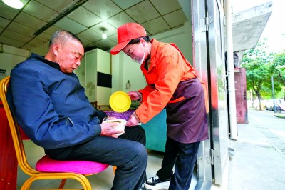 湖南省湘潭市雨湖区和平街道杉山社区,社区食堂的工作人员将午餐送到一名腿脚不便的老人家中。新华社发