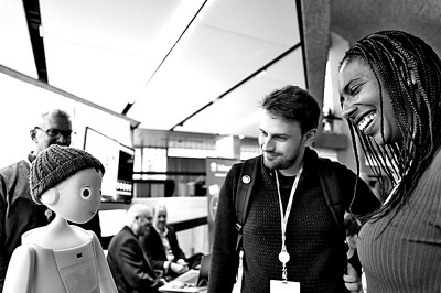 在“人工智能造福人类全球峰会”上,参会者和一个用于社会关怀的机器人互动。新华社发