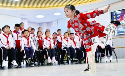 3月26日,河北省秦皇岛市海港区迎秋里实验学校开展“传统戏曲进校园”活动。据了解,该校通过引导学生学习戏曲知识、表演戏曲片段、互动体验等多种方式,让学生感受中华传统文化魅力,迎接“世界戏剧日”。图为学生在表演戏曲动作探海。