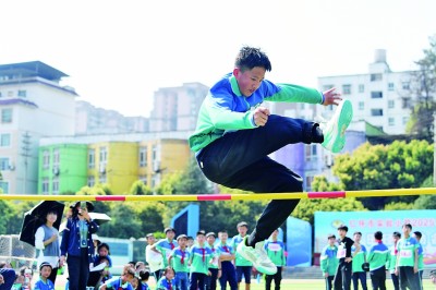 日前,贵州省遵义市仁怀市实验小学举行田径运动会,让学生们享受运动带来的乐趣,在明媚春光中释放活力、增强体质。图为学生在参加跳高比赛。近年来,贵州省仁怀市各中小学校坚持体教融合,在丰富学生校园文体生活的同时,助力学生健康成长。陈勇摄/光明图片
