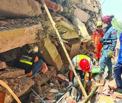 与此同时,首批到达灾区的中国其他专业救援力量已全面展开行动。中国公羊救援队在曼德勒天空别墅废墟中搜寻生命迹象,他们身着黑黄相间的制服,忙碌地穿梭在废墟之间。中国蓝天救援队则抵达曼德勒长城酒店开展救援行动,“蓝天救援”黄色字样在灰色的废墟中格外显眼。