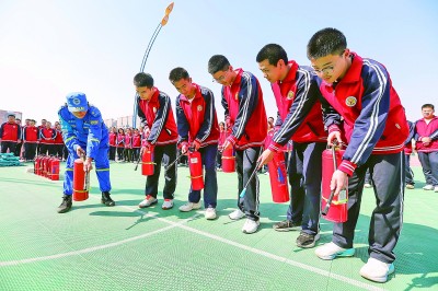 河北省遵化市第一中学的学生在学习使用灭火器。新华社发