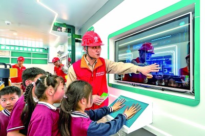 江苏吴江云龙实验学校的学生在国网苏州供电公司安全员指导下,体验智能模拟触电设备,学习安全用电知识。谢鹏摄/光明图片