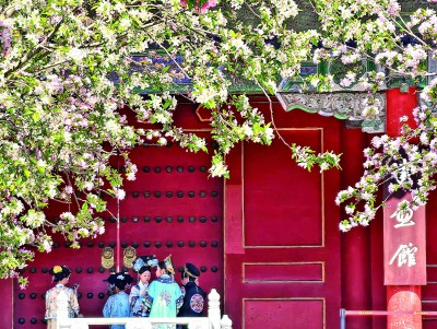 春日故宫,海棠、丁香、玉兰、梨花等竞相开放,繁花似锦,构成一幅幅美丽春日画卷。图为北京故宫博物院文华殿前海棠盛开。新华社记者 王海燕摄