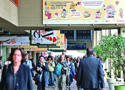 3月31日,人们经过中国上海国际童书展在第62届博洛尼亚童书展上的海报。
