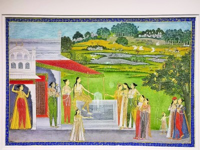 1770年,一位印度画家用水彩和金箔创作了《喷泉花园中的公主聚会》。这幅收藏于大都会艺术博物馆的作品,描绘了宫廷花园的聚会场景。画面中央是一个喷泉,周边围绕一群身着飘逸束腰外衣的公主。画家舍弃了透视规则,戏剧化地强调了喷泉的整体布局。