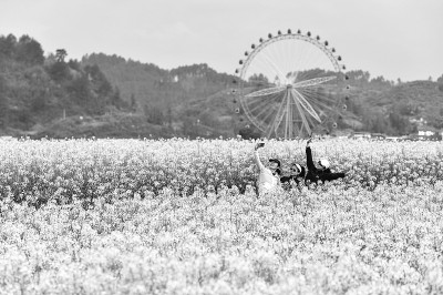 4月1日,游客在贵州省贵定县盘江镇“金海雪山”景区的油菜花田里拍照。新华社记者 杨文斌摄