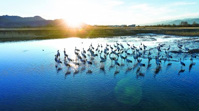 成群结队的黑颈鹤在拉萨河嬉戏、觅食。益西丹增摄/光明图片