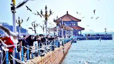 游客在青岛栈桥码头赏海鸥。董志刚摄/光明图片