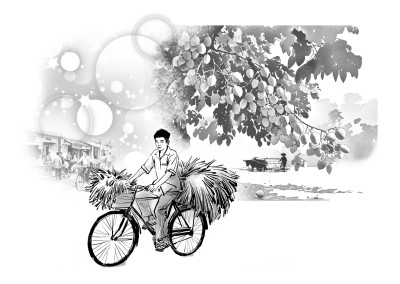 我走在上坡下坡起起伏伏的公路上,偶尔身后响起几声车铃。后座上坐着人或驮着货物的自行车,嗖一声从身旁蹿出。一直看着它在前方拐了个弯,消失在夕照已尽的桉树林里。